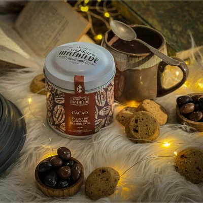 Cacao éclats de caramel beurre salé, incroyable mariage d’un cacao fondant avec la douceur des éclats de caramel beurre salé