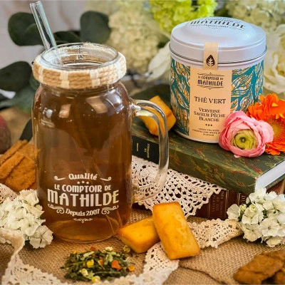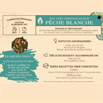 Thé vert aux notes fruitées et florales de la pêche blanche mises en valeur par la fraicheur de la verveine